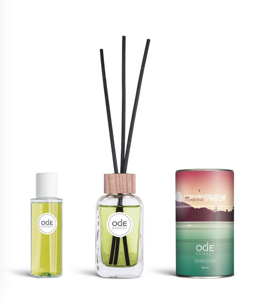 Top note: Citron, Bergamot, MintHeart note: Pine, LavenderBase note: Violet flowers, hayApproximate diffusion time for the 100 ml bottle, 2 months.Approximate diffusion time for the 200 ml bottle, 3 months. Ode Annecy AUTOMNE contains the following components: – a reusable cylindrical pack adapted to the format of the bottle with lid – a 100 or 200 ml bottle filled with the Ode Annecy AUTOMNE perfume – a wooden ring with a central metal circle to place on the bottle – 3 black capillas (sticks) in biosourced and biodegradable synthetic fiber Instructions for use: – Unseal the plastic protection of the cap – Remove the cap, keep for reuse of the bottle – Position the wooden ring on the opening of the bottle – Insert the capillas into the orifice of the ring and leave to impregnate – Return the capillas every week or every 15 days depending on the flow of excess and the diffusion of the perfume.Delivery, shipmentsThree possibilities are available to you: - Free delivery on Annecy - France shipping package - €8.50 including tax - Package OUTSIDE France - €15.00 including taxChoice to make from the supplements offered at the end of the reservation.