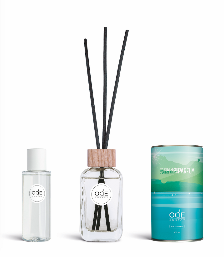 Top note: Mint, Ginger, Aquatic note Heart note: Natural accord of white flowers, solar accord Base note: Vanilla, Amber, Sandalwood, Musk. Approximate diffusion time for the 100 ml bottle, 2 months. Shelf life approximate diffusion for the 200 ml bottle, 3 months. Ode Annecy ÉTÉ contains the following components: – a reusable cylindrical pack adapted to the format of the bottle with lid – a 100 or 200 ml bottle filled with the Ode Annecy ÉTÉ perfume – a wooden ring with a central metal circle to place on the bottle – 3 black capillas (sticks) in biosourced and biodegradable synthetic fiber Instructions for use: – Unseal the plastic protection of the cap – Remove the cap, keep for reuse of the bottle – Position the wooden ring over the opening of the bottle – Insert the capillas into the opening of the ring and leave to soak – Turn the capillas every week or every 15 days depending on the flow of traffic and the diffusion of the perfume.Delivery, shipmentsThree possibilities are available to you: - Free delivery in Annecy - France shipping package - €8.50 including tax - Package OUTSIDE France - €15.00 including taxChoice to make from the supplements offered at the end of the reservation.