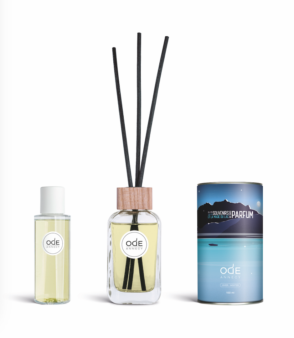 Top note: Royal Cinnamon, Peppermint, OlibanumHeart note: Nicaragu Coffee, Birch, Iris Accord, JasmineBase note: Texas Cedar, Patchouli, Vetiver, MuskApproximate diffusion time for the 100 ml bottle, 2 months.Diffusion duration approximate for the 200 ml bottle, 3 months.Ode Annecy AUTUMN contains the following components: – a reusable cylindrical pack adapted to the format of the bottle with lid – a 100 or 200 ml bottle filled with the Ode Annecy WINTER perfume – a ring made of wood with a central metal circle to place on the bottle – 3 black capillas (sticks) in biosourced and biodegradable synthetic fiber Instructions for use: – Unseal the plastic protection of the cap – Remove the cap, keep for reuse of the bottle – Position the wooden ring on the opening of the bottle – Insert the capillas into the opening of the ring and leave to soak – Turn the capillas every week or every 15 days depending on the flow and diffusion of the perfume.Delivery, shipmentsThree possibilities #39;offer to you: - Free delivery in Annecy - France shipping package - €8.50 including tax - Package OUTSIDE France - €15.00 including taxChoice to make from the supplements offered at the end of the reservation.